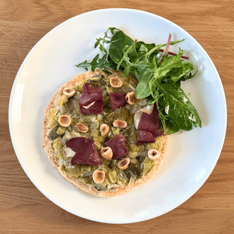 Tarte fine aux poireaux braisés, magret fumé et noisettes torréfiées